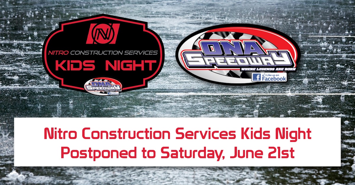 ONA, WV-After analyzing several weather apps and looking at the current radar with storms already popping up, the Ona Speedway has made the decision to postpone tonight’s Nitro Construction Services Kids Night to next Saturday, June 21st. With every weather app calling for a 60-80% chance of rain at race time, it is just not smart to try to race tonight.
