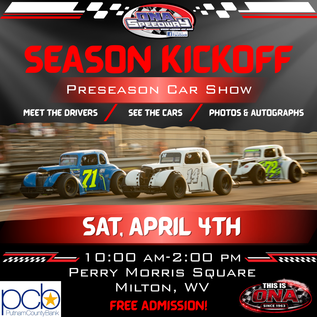 ONA, WV-The Ona Speedway is proud to announce the 2026 Season Kickoff Preseason Car Show set for Saturday, April 4th. The event will take place at Perry Morris Square in Milton, WV in the Putnam County Bank parking lot.